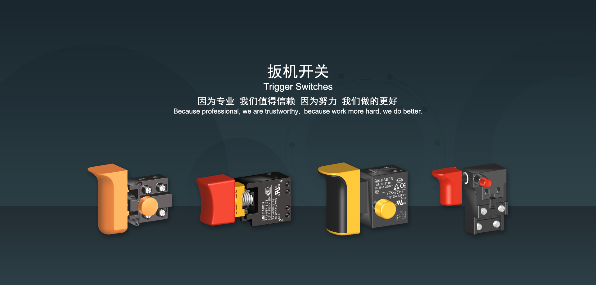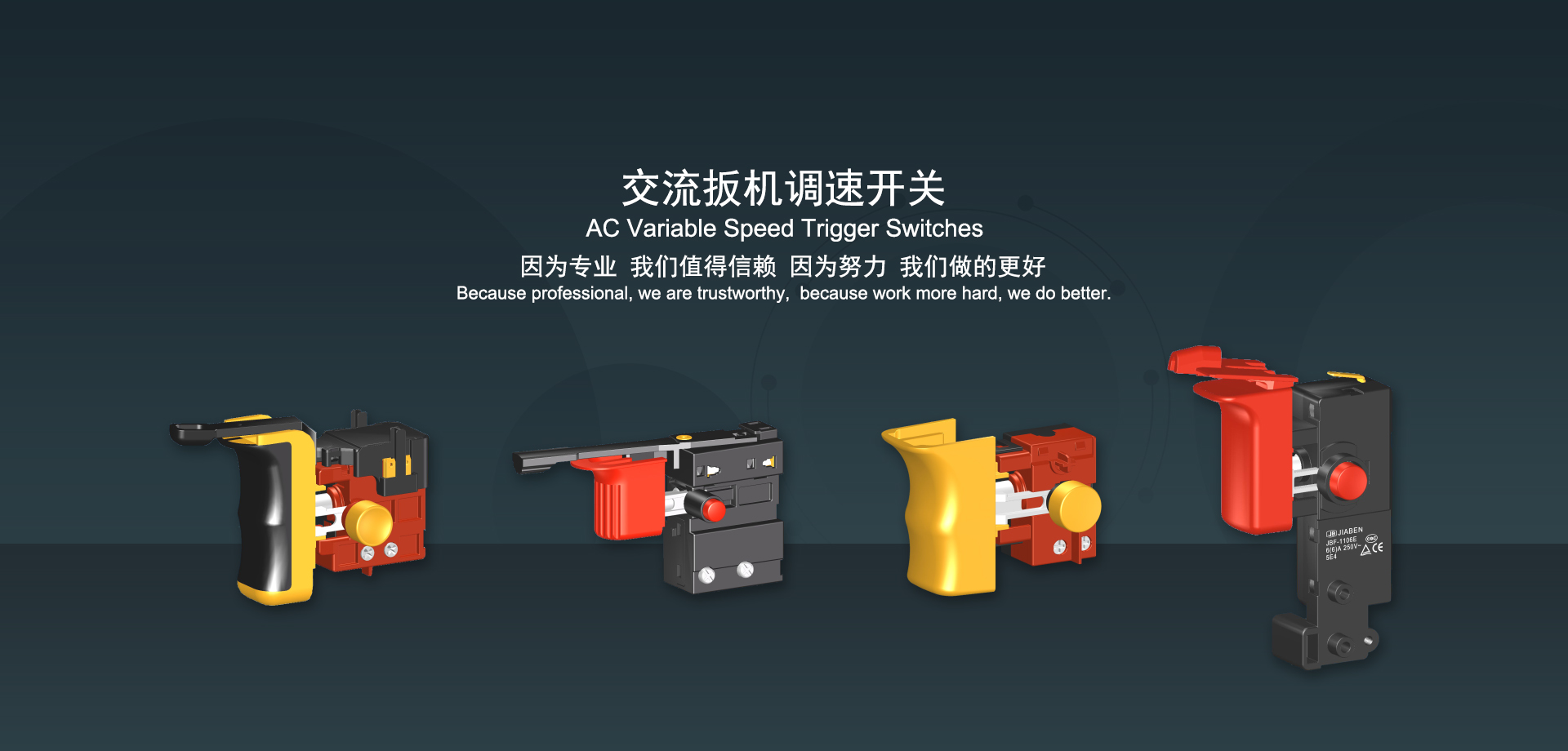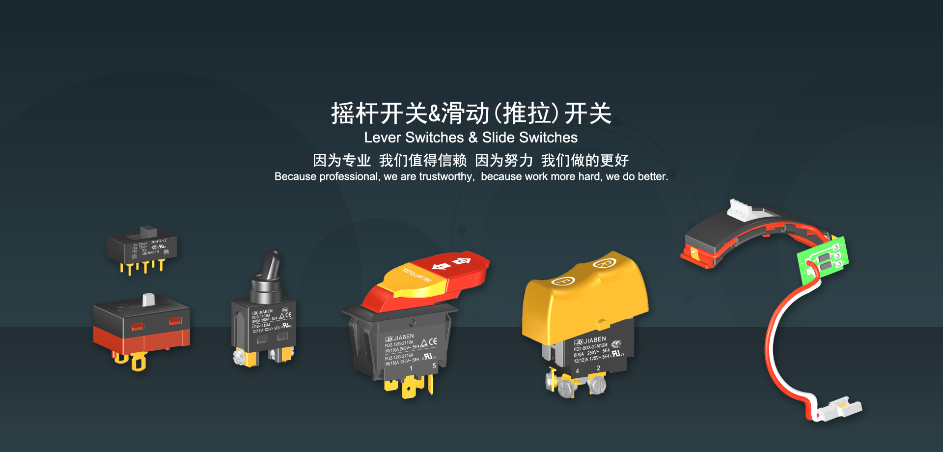 浙江佳奔電子有限公司始建于1986年,坐落于浙江省樂清市虹橋鎮(zhèn)東電子信息產業(yè)園內,現有職工700多人,資產總額超3億元。公司主要經營“JIABEN”牌微動開關、蹺板開關、按鈕開關、扳機開關、調速開關和電位器開關等各類交、直流器具開關和各類交、直流線路板模塊等產品,主要應用于交、直流電動工具、電動園林工具、清潔器具、家用電器和小型機床等行業(yè),是集產品設計、研發(fā)、制造、銷售和服務于一體的國家高新技術企業(yè)。JIABEN was founded in 1986, located in East Electronic Information Industry Park, Hongqiao Town, Yueqing City, Zhejiang Proviance, existing staff more than 700 peoples, more than 300 million RMB worth of assets. Company is mainly engaged in "JIABEN" brand Micro Switch, Rocker Switch, Push-button Switch, Trigger Switch, Speed Regulating Switch, Potentiometer Switch and other kinds of appliance switch and all kinds of AC or DC circuit board module, such as more than 100 series, 8000 kinds of models of products, mainly used in AC or DC Power-tools, Power Gardening Tools, Cleaning Appliances, Household Appliances and Small Machine Tool and other industries, is the collection product design, research and development, manufacturing, sales and service in one of the national high and new technology enterprise.