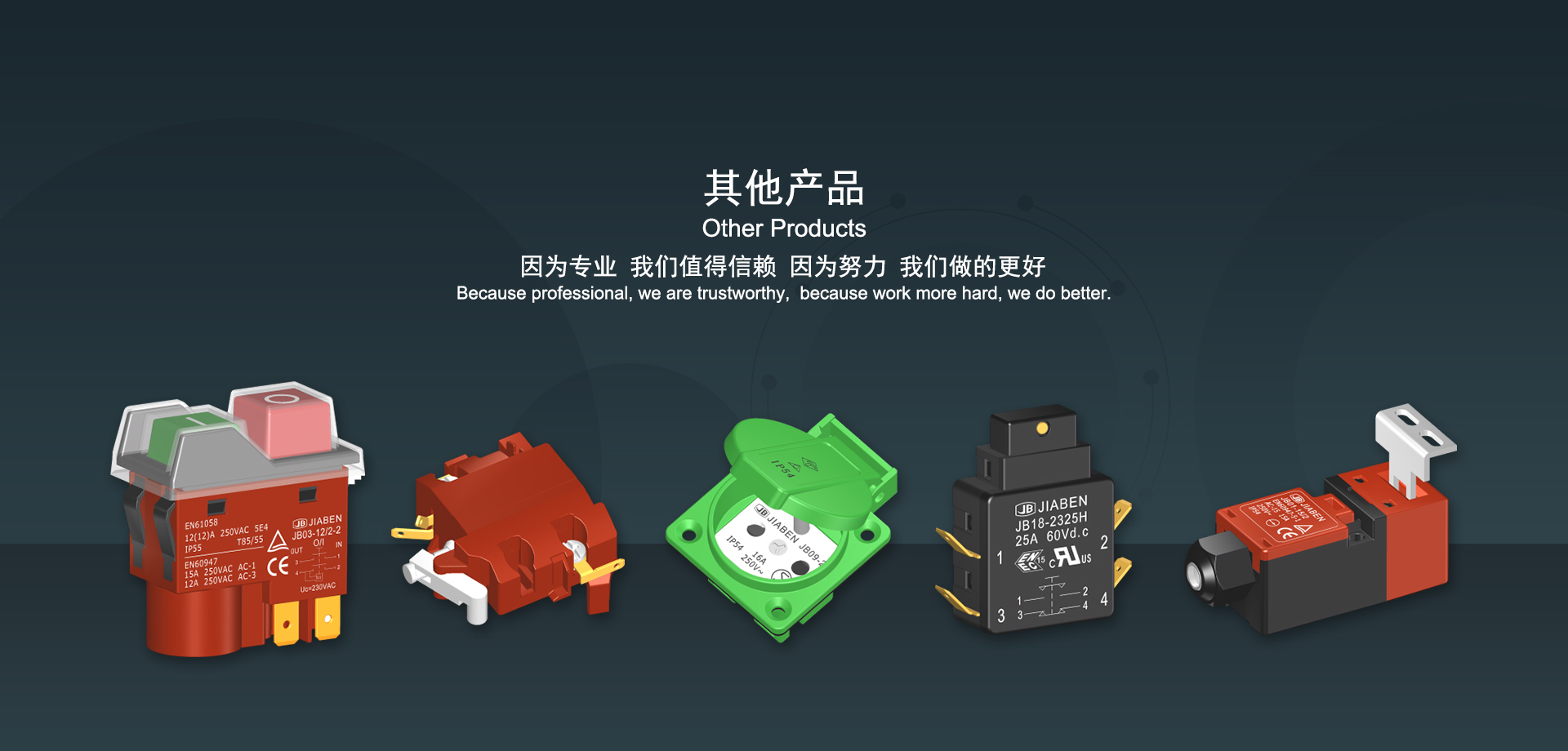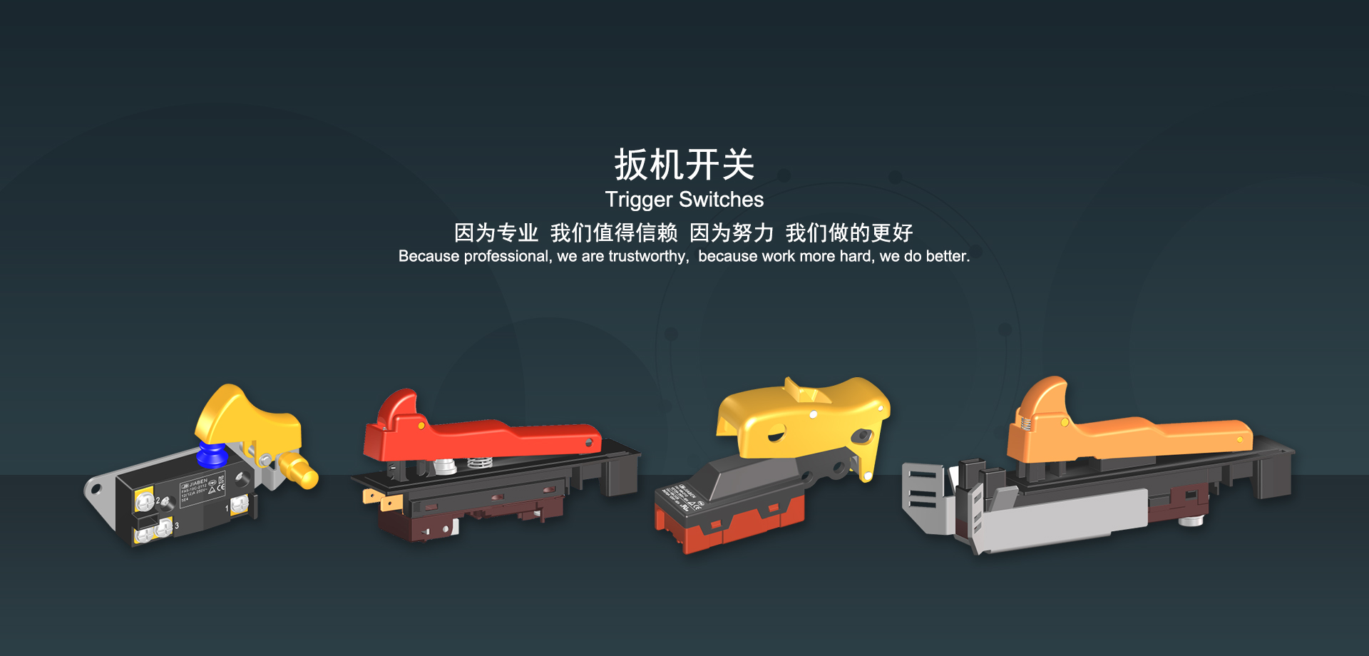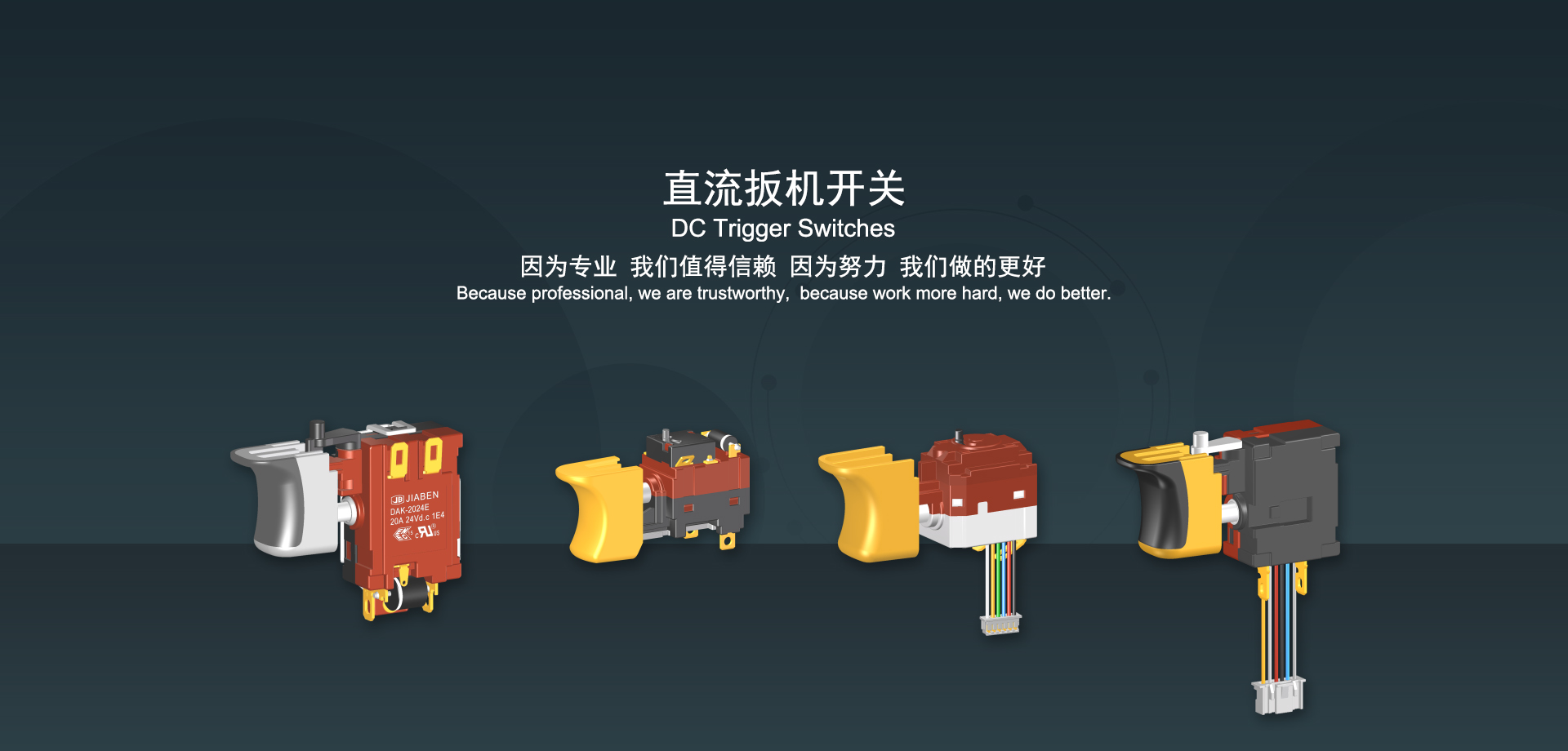 浙江佳奔電子有限公司始建于1986年,坐落于浙江省樂清市虹橋鎮(zhèn)東電子信息產業(yè)園內,現有職工700多人,資產總額超3億元。公司主要經營“JIABEN”牌微動開關、蹺板開關、按鈕開關、扳機開關、調速開關和電位器開關等各類交、直流器具開關和各類交、直流線路板模塊等產品,主要應用于交、直流電動工具、電動園林工具、清潔器具、家用電器和小型機床等行業(yè),是集產品設計、研發(fā)、制造、銷售和服務于一體的國家高新技術企業(yè)。JIABEN was founded in 1986, located in East Electronic Information Industry Park, Hongqiao Town, Yueqing City, Zhejiang Proviance, existing staff more than 700 peoples, more than 300 million RMB worth of assets. Company is mainly engaged in "JIABEN" brand Micro Switch, Rocker Switch, Push-button Switch, Trigger Switch, Speed Regulating Switch, Potentiometer Switch and other kinds of appliance switch and all kinds of AC or DC circuit board module, such as more than 100 series, 8000 kinds of models of products, mainly used in AC or DC Power-tools, Power Gardening Tools, Cleaning Appliances, Household Appliances and Small Machine Tool and other industries, is the collection product design, research and development, manufacturing, sales and service in one of the national high and new technology enterprise.